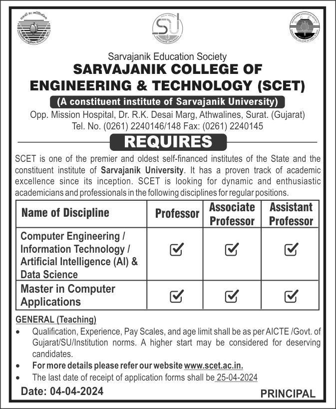 - Address: The Principal, Sarvajanik College of Engineering & Technology, Opp. Mission Hospital, Dr. R.K.Desai Marg, Athwalines, Surat - 395001