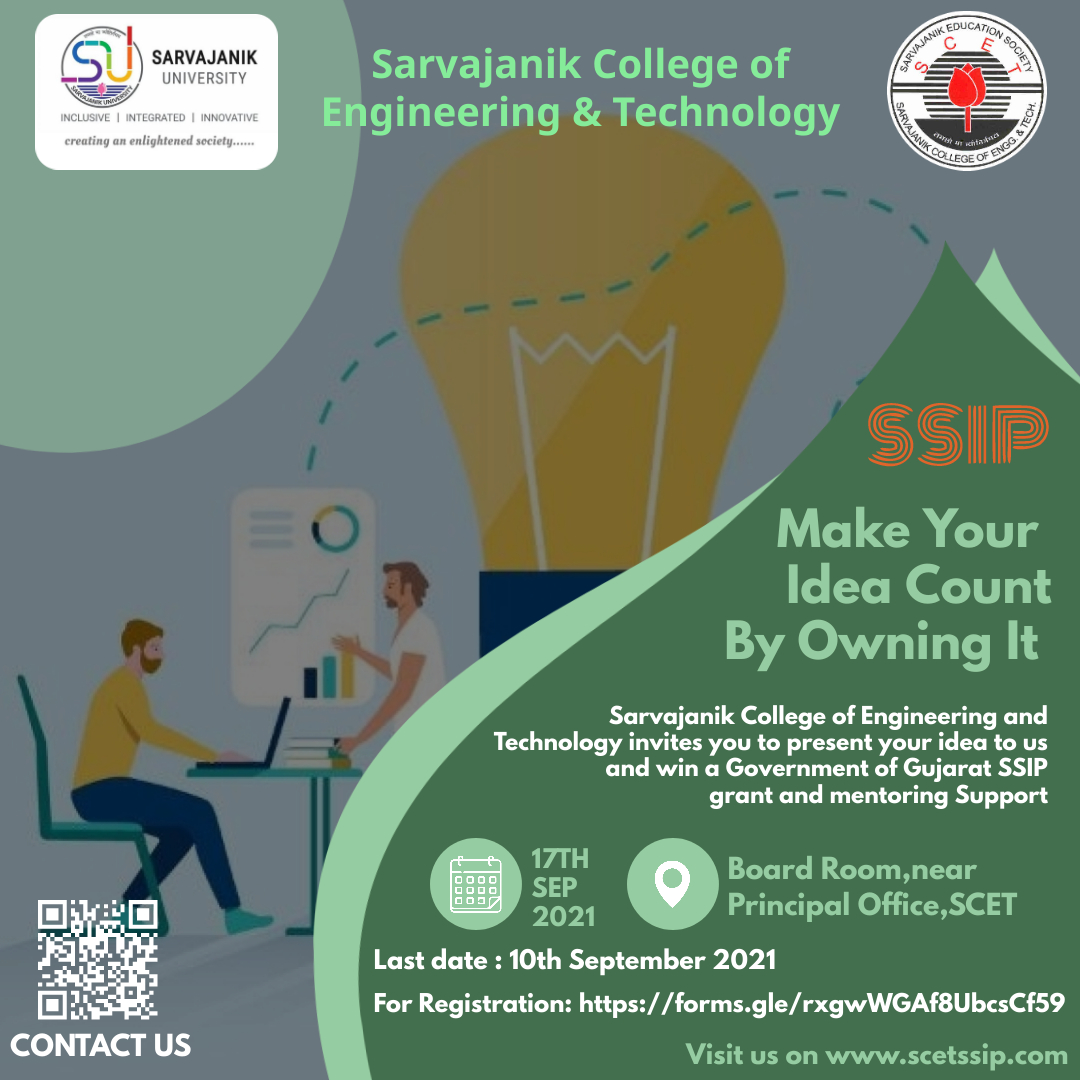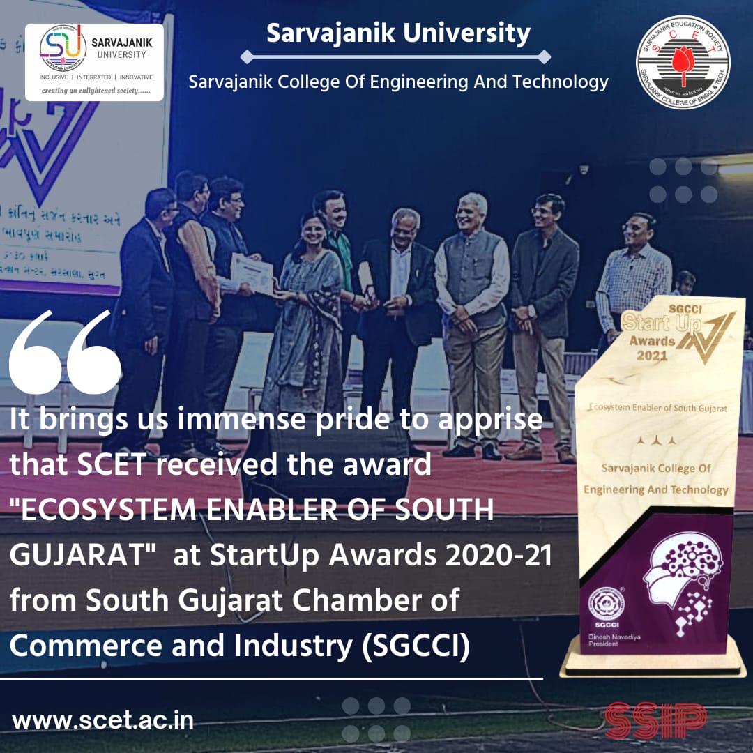 Student Startup and Innovation Policy of Gujarat was launched by the Education Department, Government of Gujarat to facilitate building innovation and pre-incubation processes across the state. Under the aegis of the policy, Sarvajanik College of Engineering & Technology (SCET) inscribed an MoU in MAY 2019 with the policy’s central implementation nodal agency, Gujarat Knowledge Society. As part of the policy, the Government of Gujarat provides SCET with an annual grant of INR 50 lakhs. This grant empowers SCET to develop a self-sufficient motto driven ecosystem among the student community.